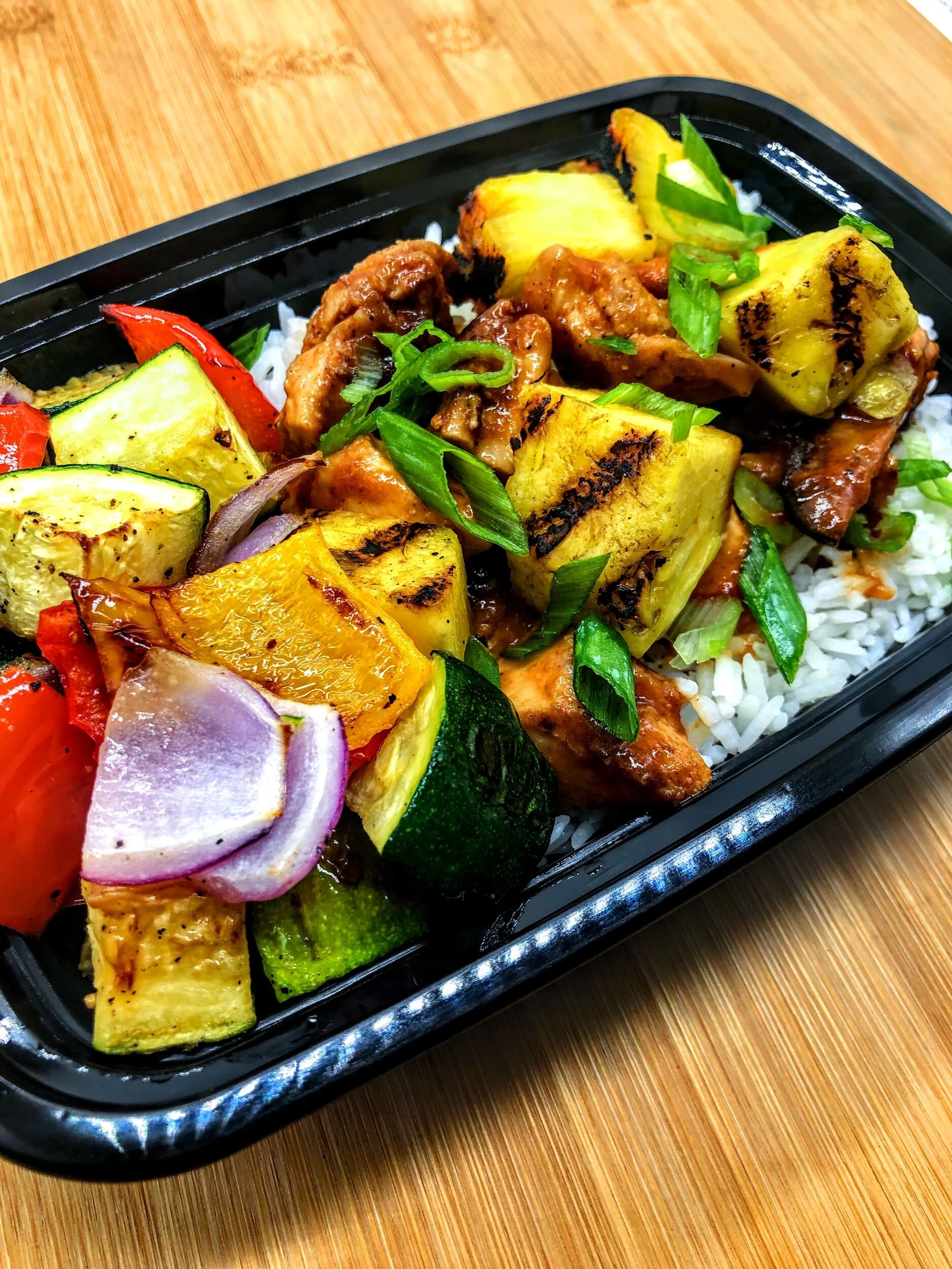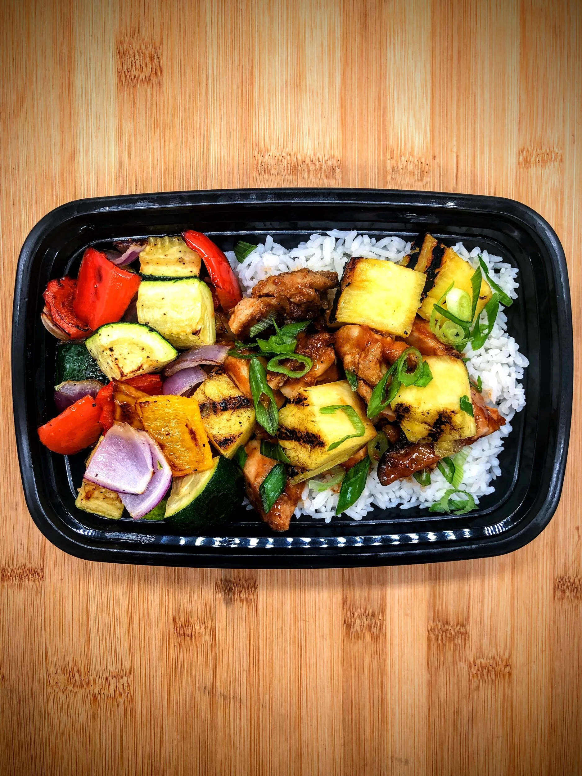 Ingredients: Chicken breast, jasmine rice, coconut milk, cauliflower rice, pineapple, zucchini, bell peppers, red onion, tamari, sugar-free ketchup, sriracha, olive oil, rice vinegar, apple cider vinegar, erythritol, garlic, ginger, scallions, salt, pepper, spices