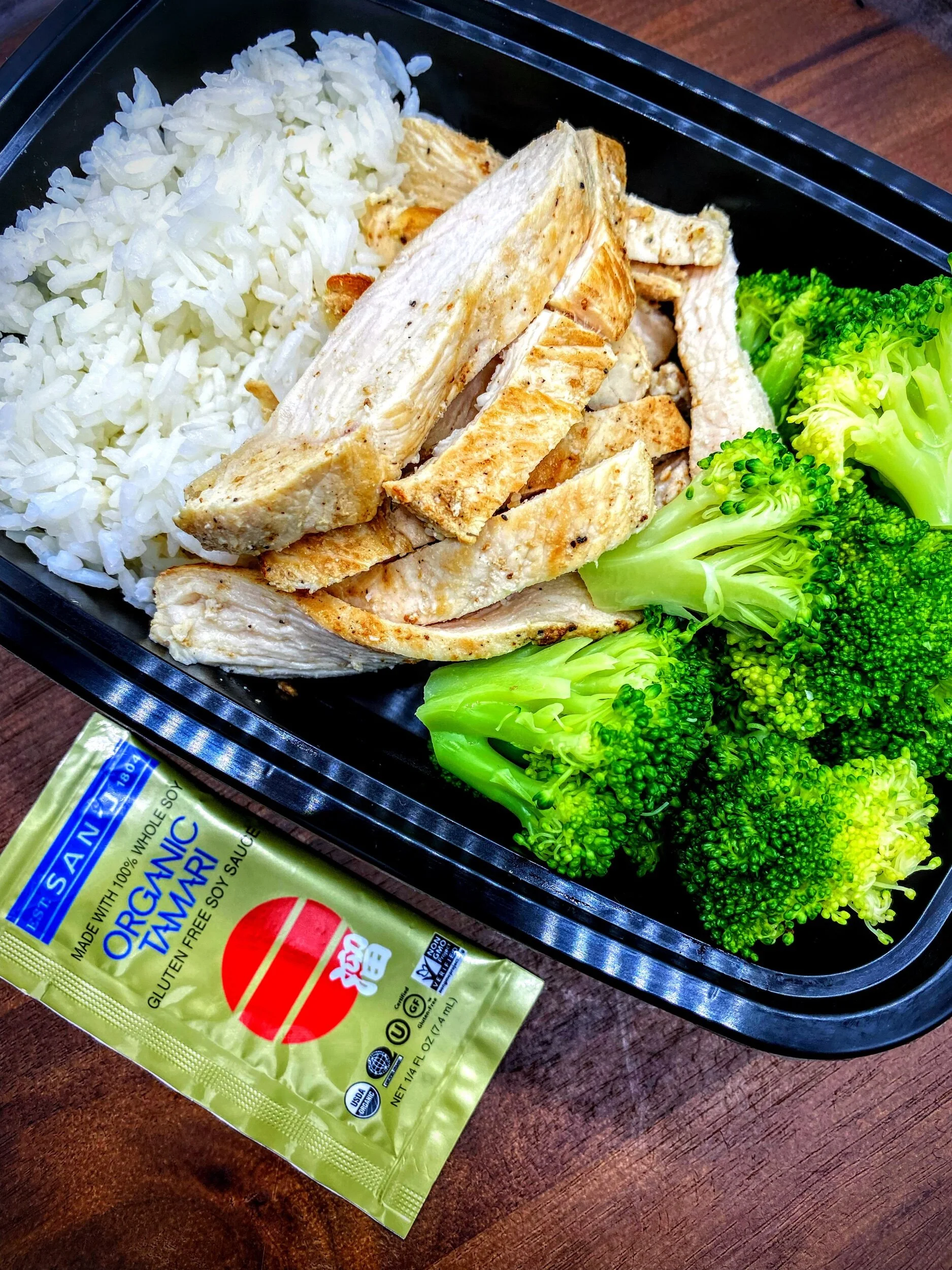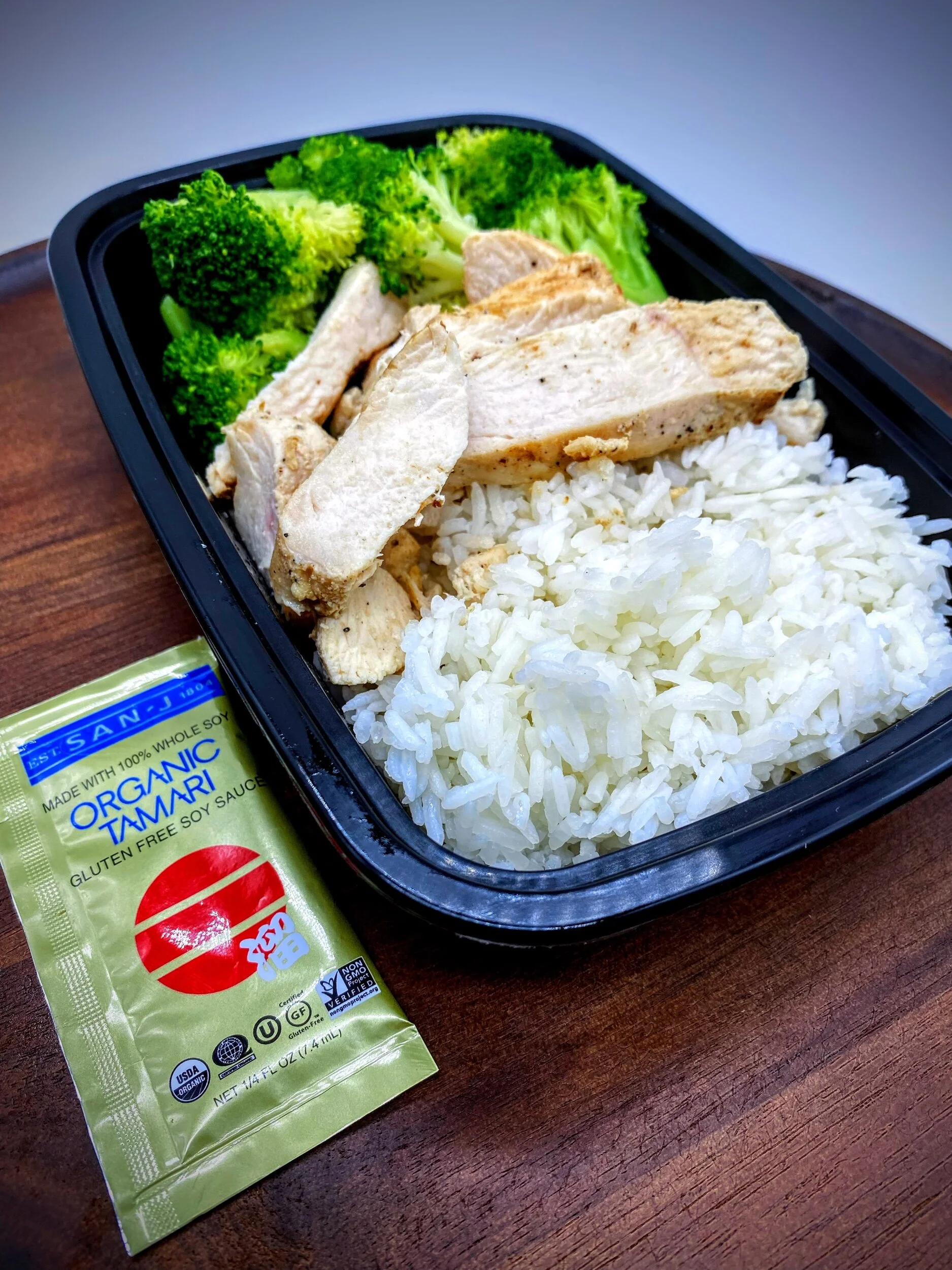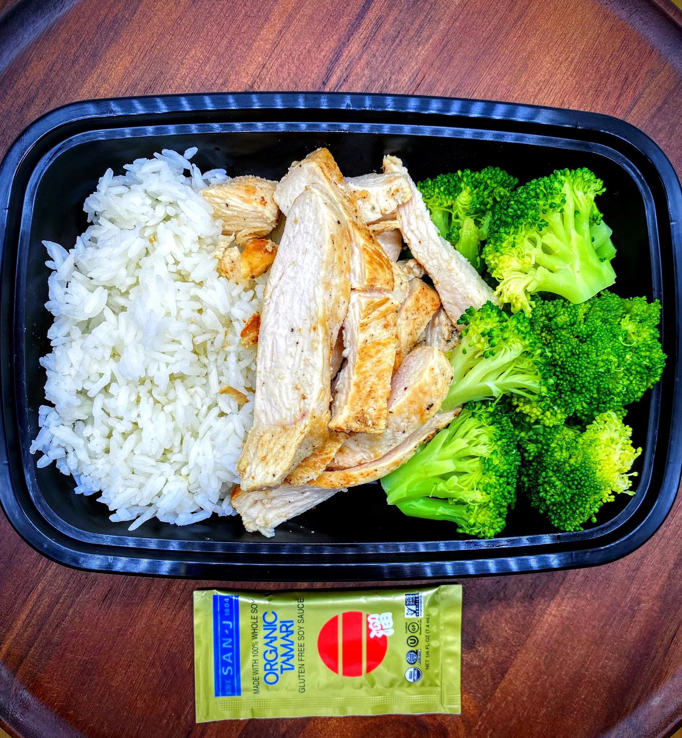 Ingredients: Chicken breast, jasmine rice, cauliflower rice (low carb), broccoli, lemon, garlic, olive oil, salt, pepper, spices, organic tamari packet