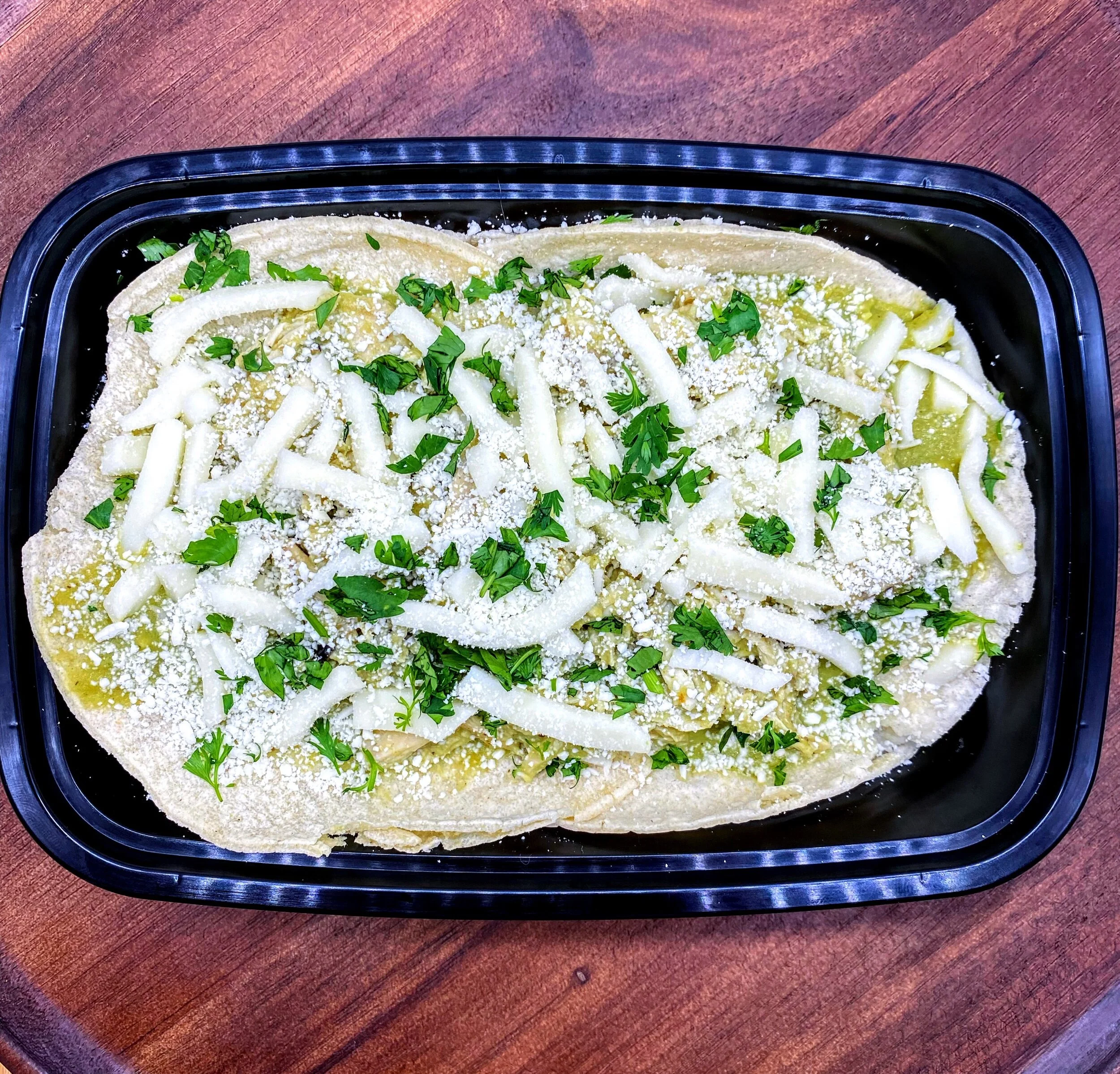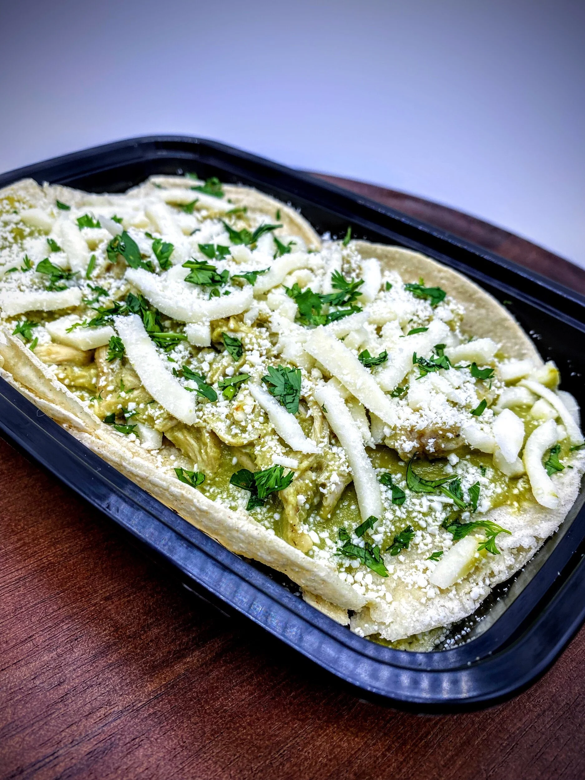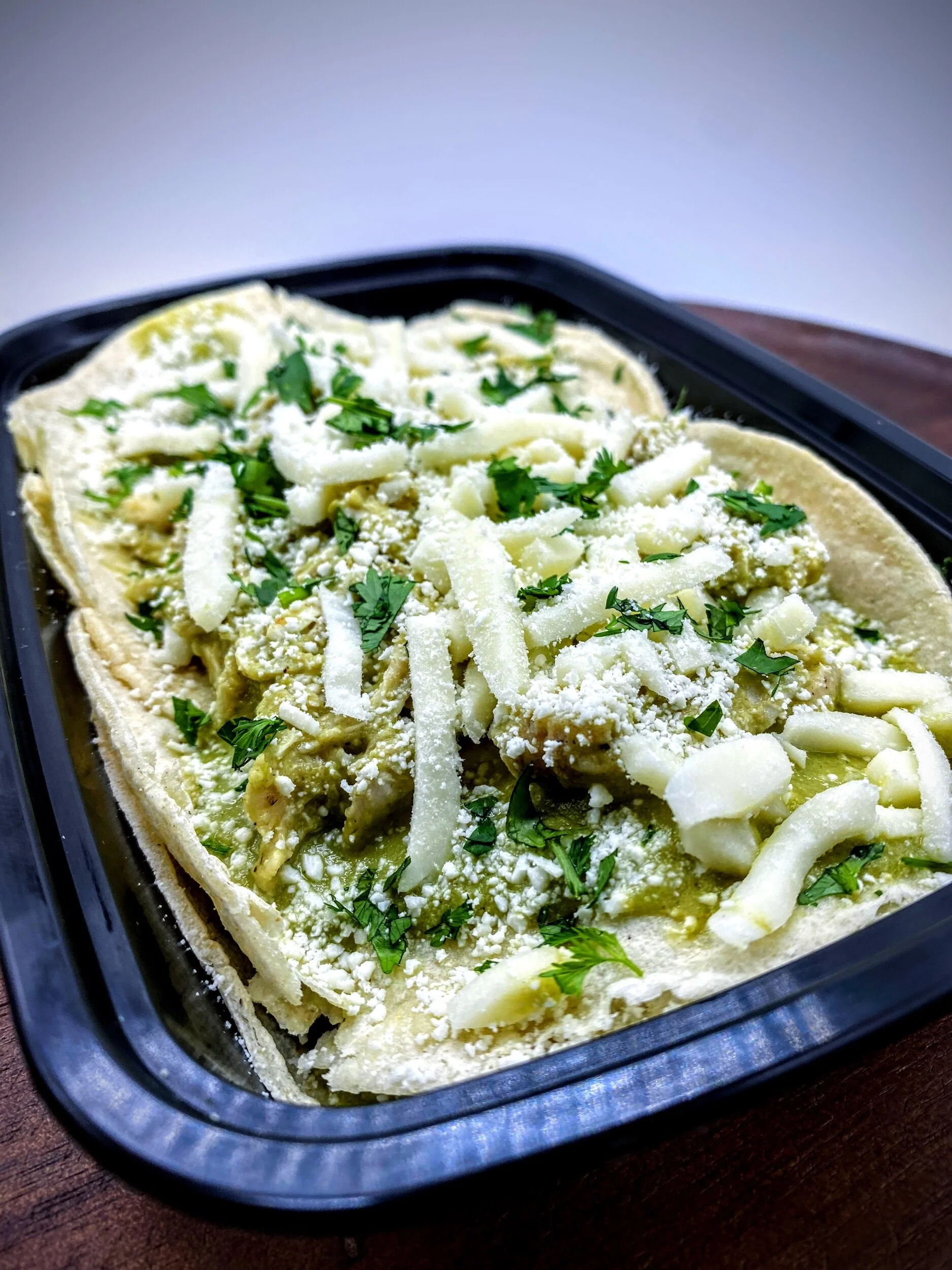 Tender shredded chicken breasts simmered in a zesty green chili enchilada sauce, layered between soft corn tortillas with melted mozzarella and cotija cheeses, black beans, and fresh cilantro.