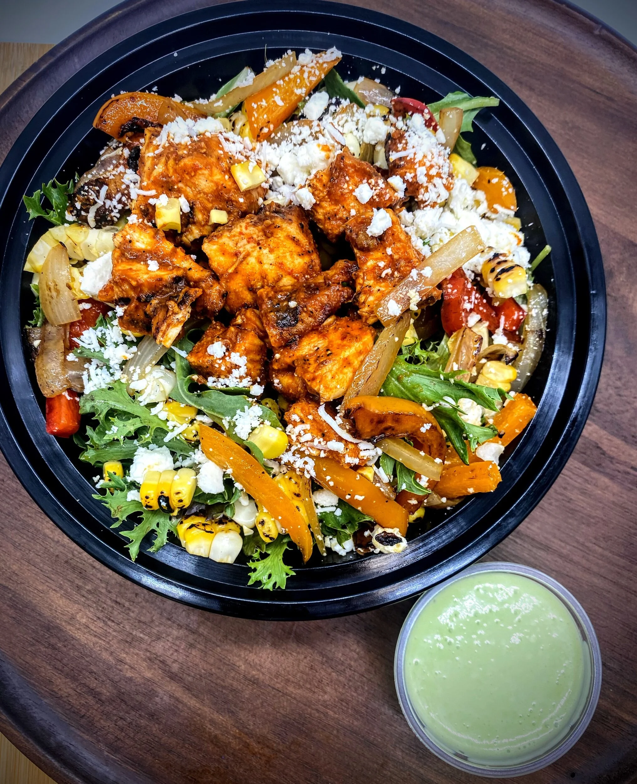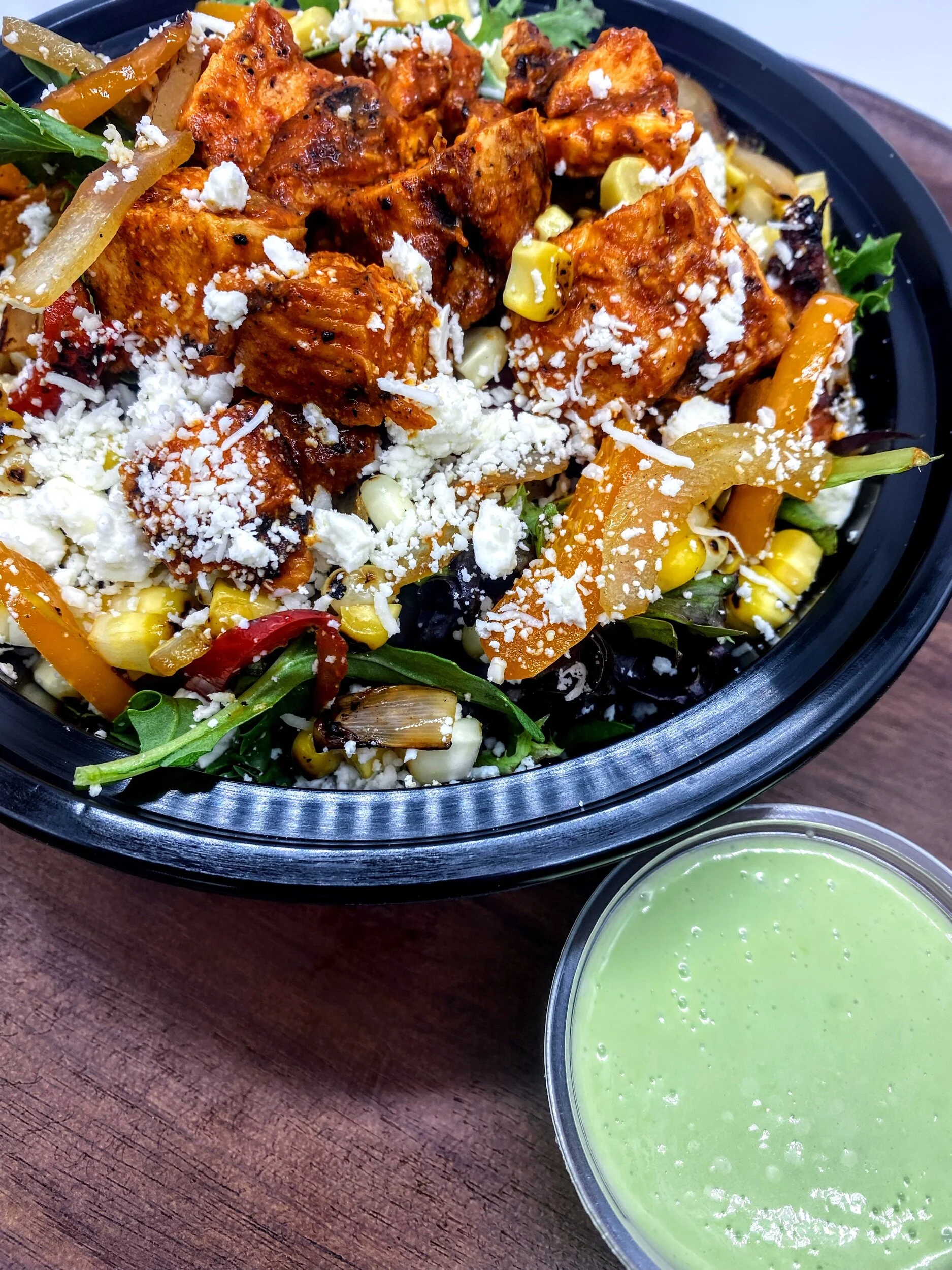 6 oz cooked guajillo chicken breast, mixed greens, charred corn, fajita peppers and onions, cotija cheese, 2 oz avocado ranch