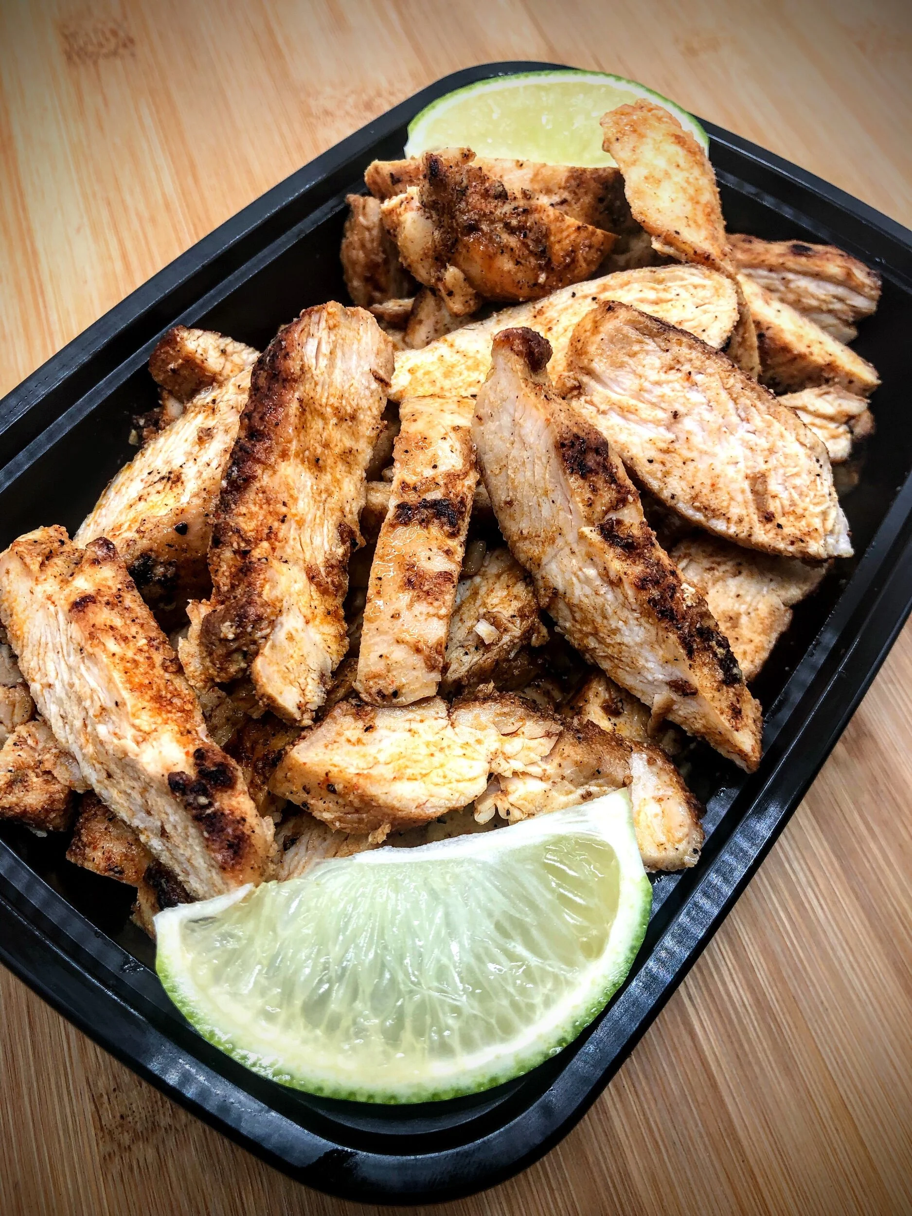 Ingredients: Chicken breast, olive oil, salt, pepper, garlic powder, onion powder, paprika, cumin, chili powder, limes