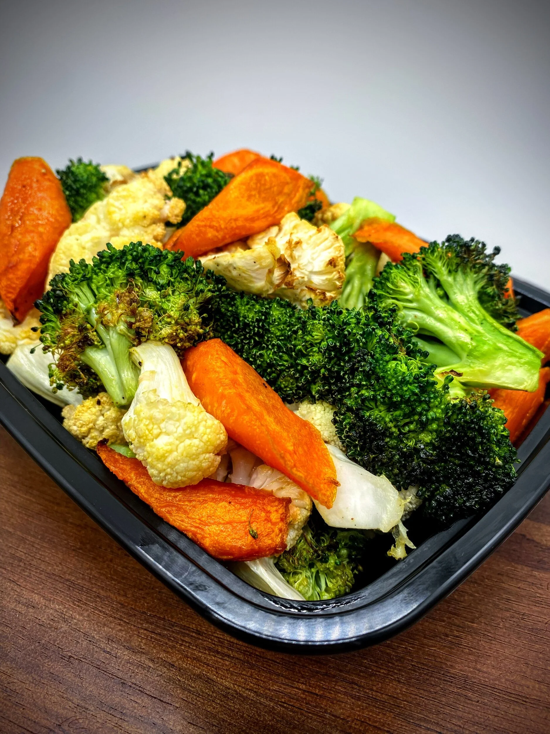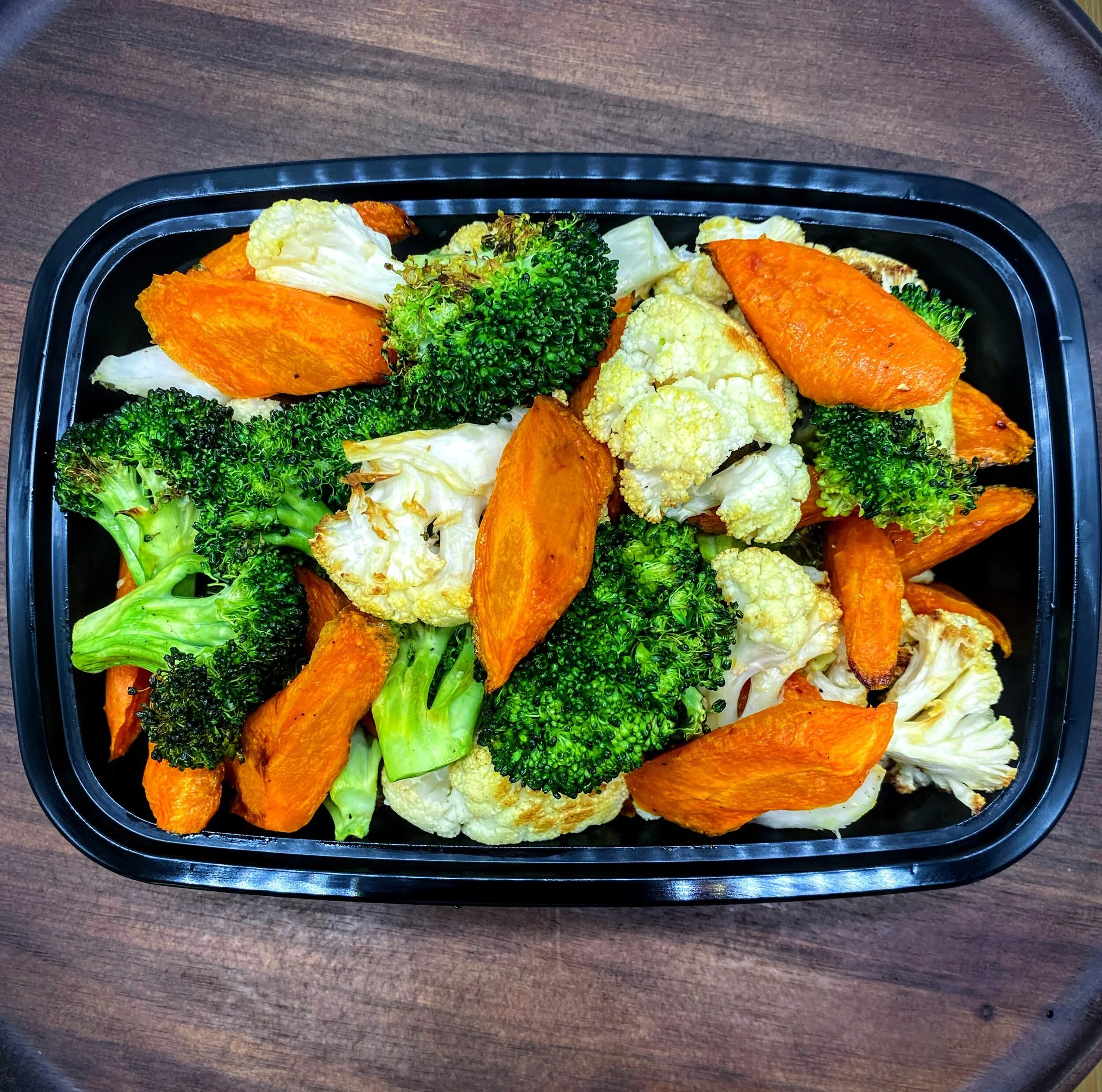 One full pound of roasted cauliflower, broccoli, and carrots. Lightly seasoned and oven-roasted for a flavorful, healthy side that pairs perfectly with any of our entrées.