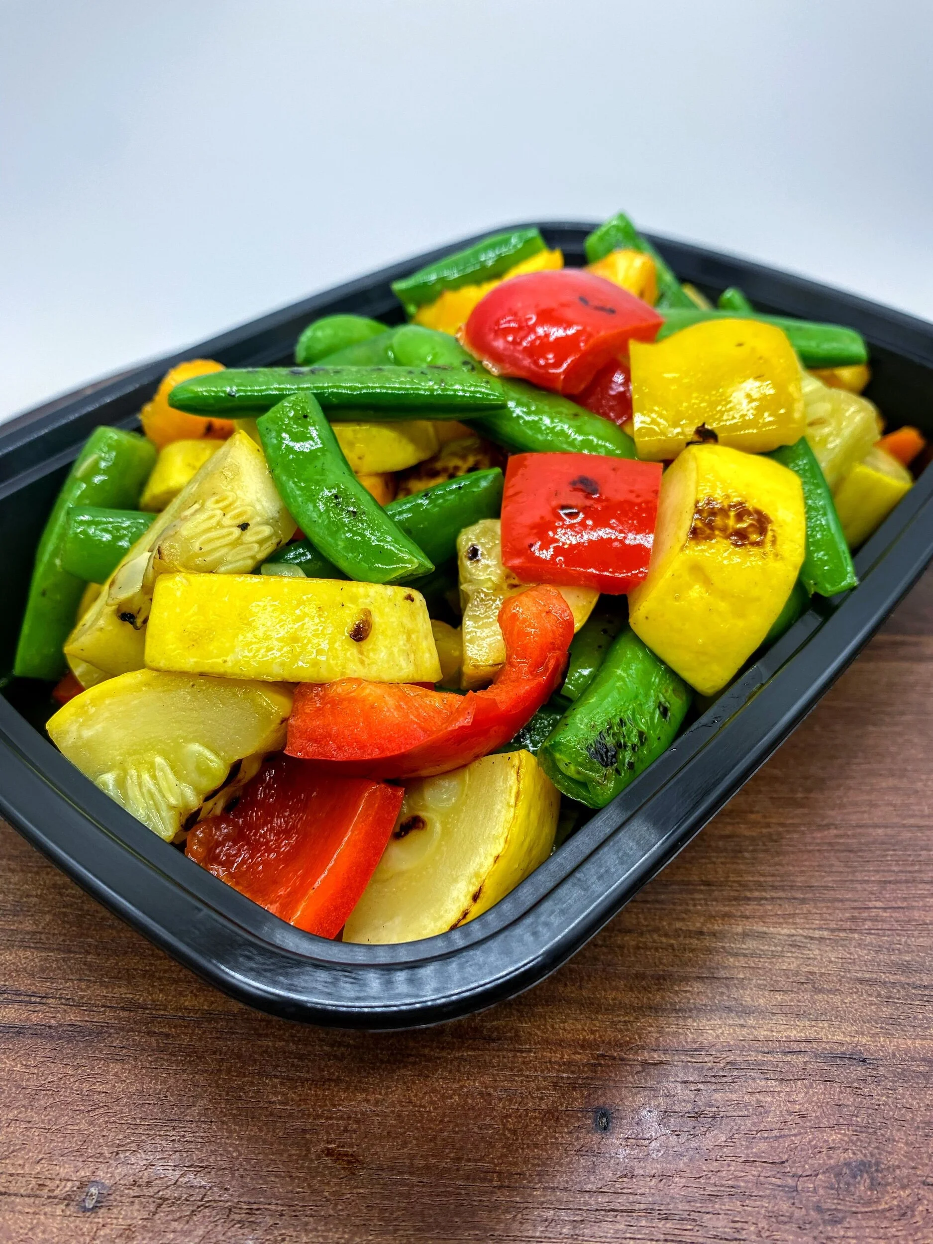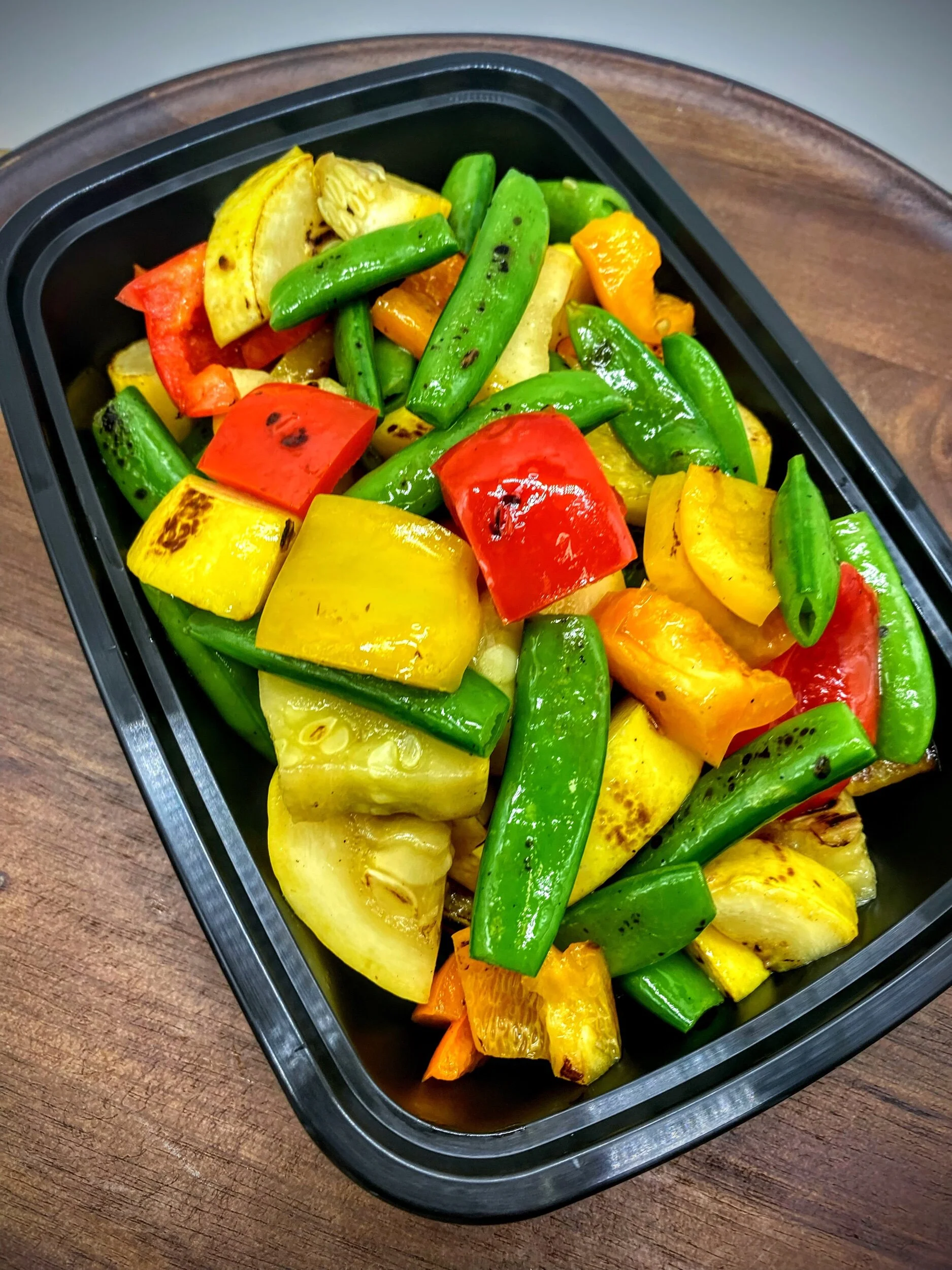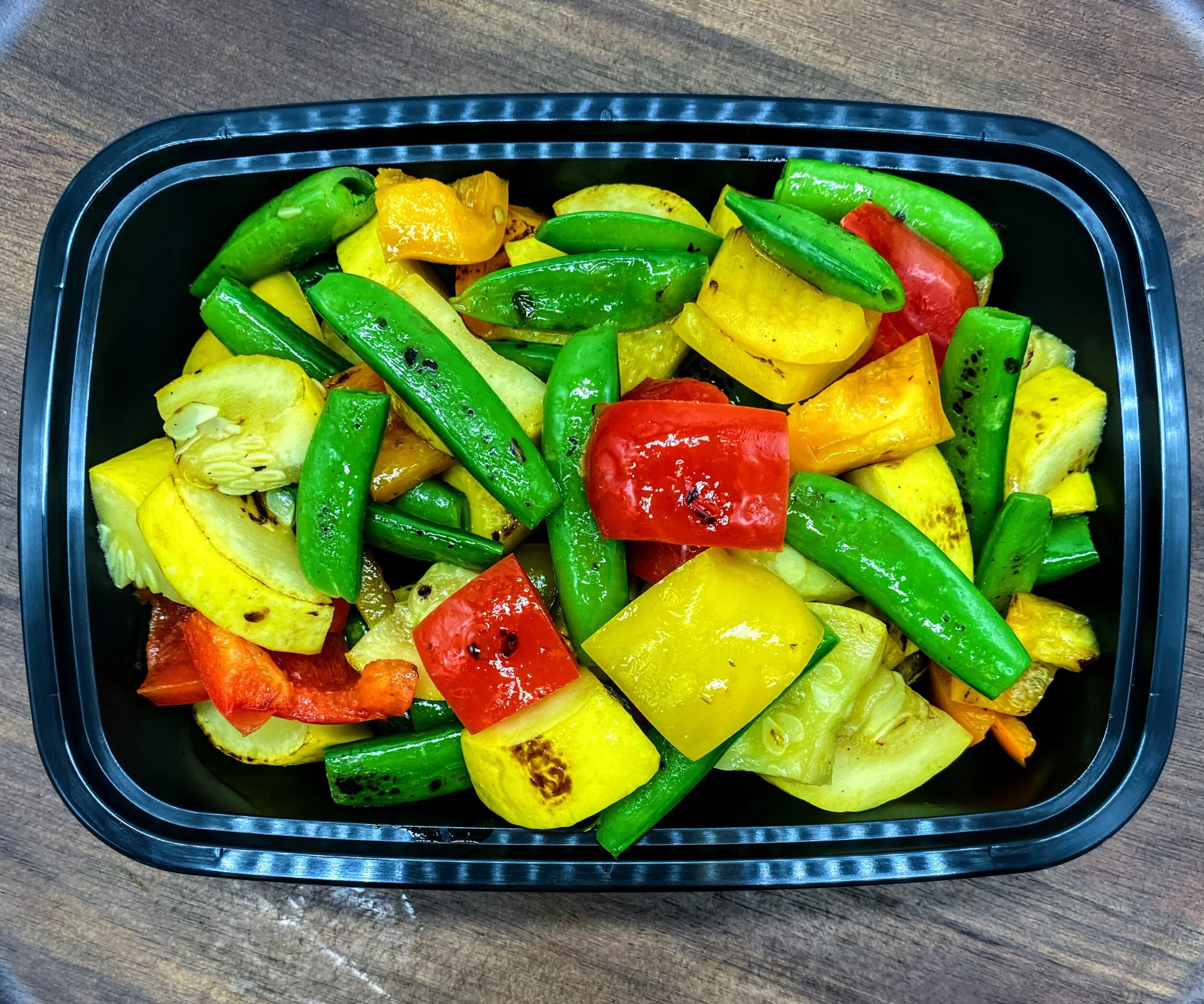 Ingredients: Sugar snap peas, yellow squash, bell peppers, olive oil, salt, pepper.