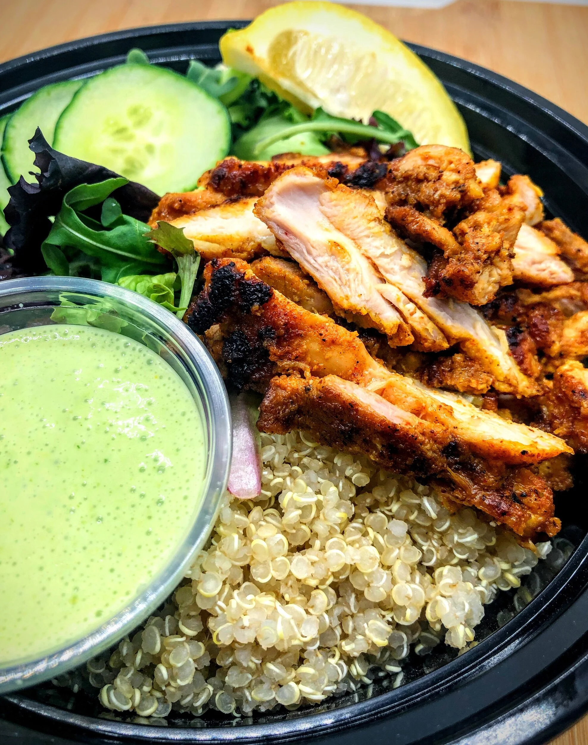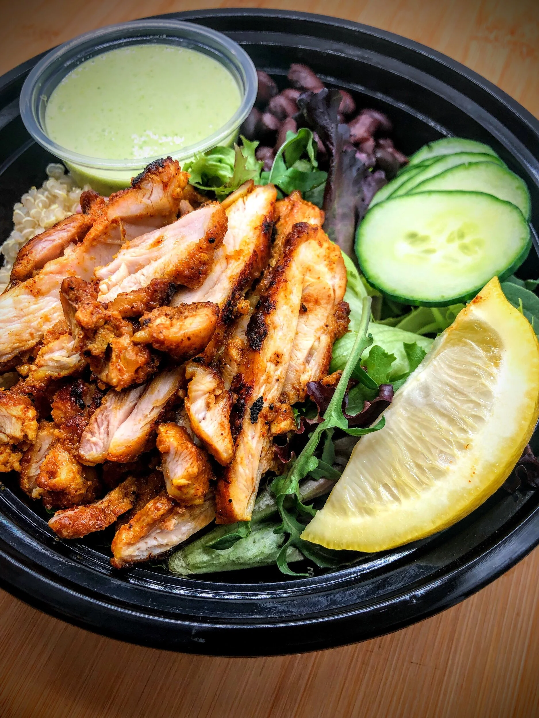 Spiced, marinated roasted chicken thighs served over a bed of mixed greens and fluffy quinoa with crisp cucumbers, black beans, and our green curry yogurt dressing. Bold, colorful, and packed with protein.
